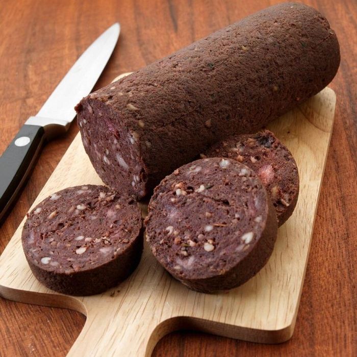 Blood Sausage is a distinct type of blood sausage originating from the United Kingdom and Ireland. It is made from pig or beef blood, along with pig or beef fat, and a type of cereal, often oatmeal, rolled oats, or barley. The high cereal ratio, along with the use of herbs such as parsley, distinguishes blood sausage from sausages eaten elsewhere in the world. As a product of the slaughter process, consuming blood sausage is closely tied to the Martinmas festival when annual livestock slaughter takes place.