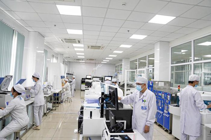 - First, the LABORATORY DEPARTMENT: Equipped with the latest medical equipment in the Mekong Delta and outstanding capacity, especially with advanced machines like Cobas Pro, Versacell, and Anility. The hospital can conduct all types of tests, from basic to specialized, supporting the diagnosis of both common and rare conditions. The laboratory is ISO certified, with over 1,000 types of tests offered, handling up to 10,000 tests per hour to meet high demand. The hospital is a strategic testing partner for 19 major hospitals in the Mekong Delta.