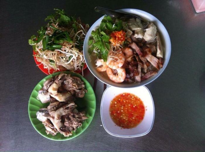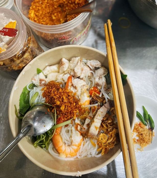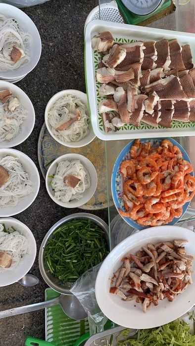 The bun nuoc leo here is delicious, with a sweet and flavorful broth and fragrant and chewy rice vermicelli. Bun Nuoc Leo Que Nhi features toppings such as snakehead fish, shrimp, and roasted pork. After boiling the snakehead fish, remove the bones and skin, leaving only the white and tender meat. The dish is accompanied by a plate of diverse and colorful vegetables, such as shredded water spinach, thinly sliced banana flowers, bean sprouts, raw garlic chives, basil, mint, lime, chili, and a bowl of fragrant chili salt.
