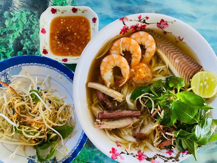 In a bowl of Delicious River Fish Noodle Soup, you will find crispy roasted pork skin, resilient and sweet river shrimp, and various vegetables such as shredded water spinach, thinly sliced banana flower, coriander, mint, lime, and chili. Enjoying a hot bowl of river fish noodle soup, combining the aroma of lemongrass, the salty sweetness of fish sauce, the pungent smell of herbs, and the spicy taste of chili, you will experience all the delicate flavors in this dish. In terms of space, Delicious River Fish Noodle Soup in Soc Trang has a relatively large area that can accommodate many customers at once without worrying about running out of seats. With a price of around 30,000 VND, you can savor the delicious specialty noodle soup in the rich culinary space of the Mekong Delta. If you happen to be in Soc Trang and don't know where to eat, check out this excellent eatery.