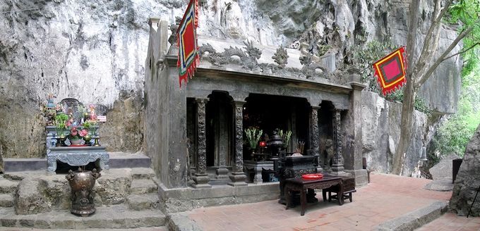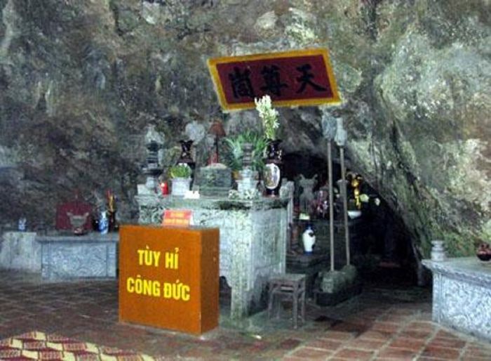 Inside the cave is the Holy Temple of Tran Vu Thien Ton, also known as Chan Vu Emperor Quan, who is the Divine Emperor incarnated as the Divine General, with the role of commanding the heavenly soldiers and generals, sent down to earth to eliminate demons and restore peace. The statue of Holy Tran Vu Thien Ton in the cave is cast in bronze, standing on the back of a turtle.