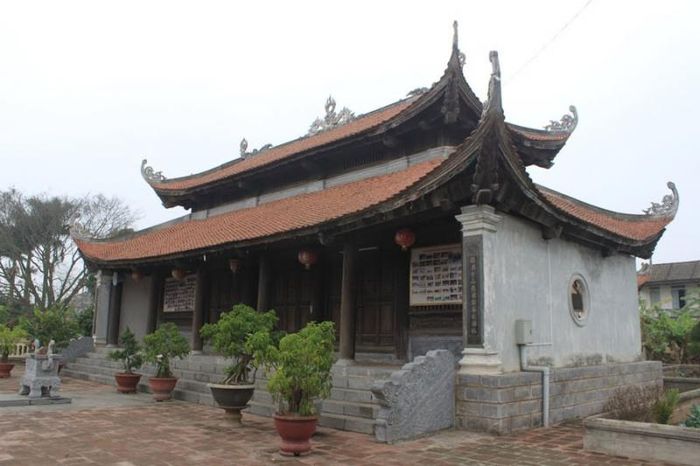 The temple was built on the foundation of the Vu Lam Royal Palace of the Tran kings, featuring the architectural style of 'Domestic Strength, Foreign Appearance'. In front of the temple, there is a precious gem well, and inside the temple courtyard, there is an eight-roofed two-story bell tower made of ironwood, where a bronze bell cast in the 19th year of Chinh Hoa era, equivalent to the year 1689, is hung.