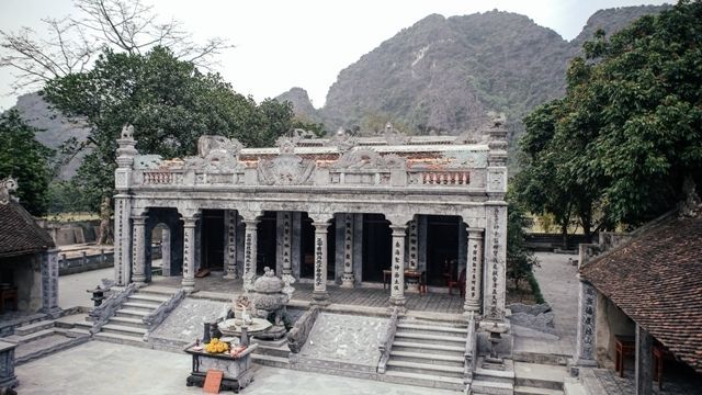 Tran Temple, majestically situated on a high mountain, has long been renowned as a sacred temple far and wide, considered the 'land-based Halong Bay'. The temple was built by King Dinh Tien Hoang in the 10th century with the intention of borrowing the saint's prestige to guard the four directions of East - West - South - North. The old temple, built of wood by King Dinh Tien Hoang, was destroyed, and during the Tran Dynasty, it was rebuilt with famous stone columns that remain intact to this day, hence it is commonly referred to as Tran Temple because it was rebuilt during the Tran Dynasty. Tran Temple is located amidst a picturesque landscape in the Trang An Eco-tourism Complex. The temple features four unique stone columns carved with the Four Sacred Animals (dragon, unicorn, tortoise, phoenix).