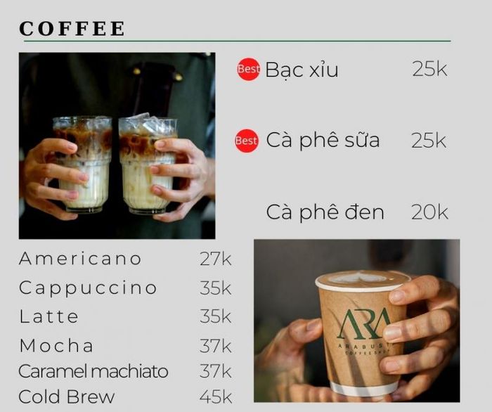 Famous for its eye-catching and delicious peach-orange lemongrass tea, A r a b u s t a has won the hearts of many visitors, making them return again and again. The drinks here are just as good as those at renowned coffee brands, yet the prices remain affordable. Apart from coffee, the cafe offers a wide variety of beverages, all with distinct flavors and exceptional quality. The peach-orange lemongrass tea, in particular, offers a wonderful fusion of sweet peach, tangy orange, and aromatic lemongrass. The coffee is made from high-quality beans, ensuring a rich, fragrant taste. If you find yourself in this area, be sure to stop by and try it out.