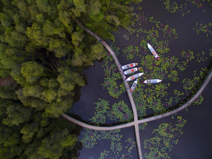 Tan Lap Floating Village - Long An is one of the most captivating destinations in the Mekong Delta that you can experience. Also known as Tan Lap Tram Forest, located in Moc Hoa District, Long An Province, this area is conveniently accessible. The highlight of this floating village is its creation from a flooded forest, home to an ecosystem rich in the distinctive features of Southern Vietnam. When visiting Tan Lap Floating Village, you will encounter Tràm trees, lotus flowers, water lilies, and lily pads, along with various birds and fish. The entire atmosphere here is simple and rustic, something you won't find in the bustling city life.