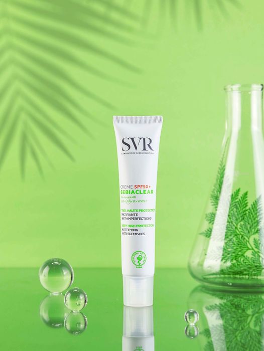An ideal sunscreen for treatment is Treatment SVR Sebiaclear Creme SPF50. The advantage of this sunscreen is its 2-in-1 formula that not only cleanses the skin, reduces acne, and controls oil but also provides comprehensive protection against harmful sunlight. You can use Treatment SVR Sebiaclear Creme SPF50 as a thin, breathable base for your skin.