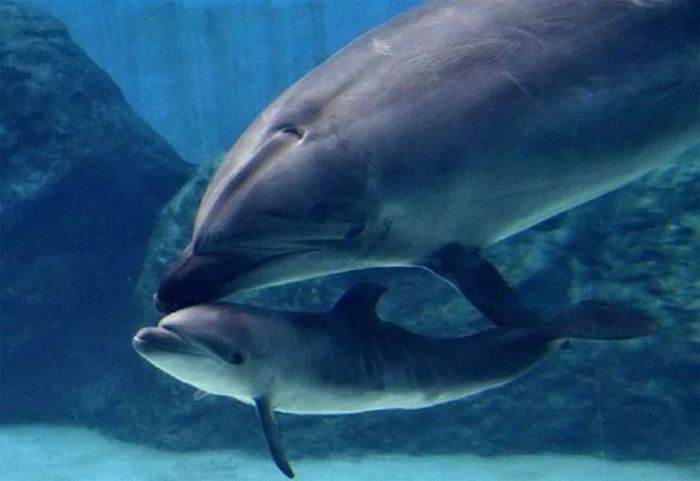 Dolphins are known for their impressive swimming speed and are among the fastest marine animals. When giving birth, their calves must quickly catch up with their mothers. To assist in this, mother dolphins take the lead, constantly scanning their surroundings to create a safe space for their young.