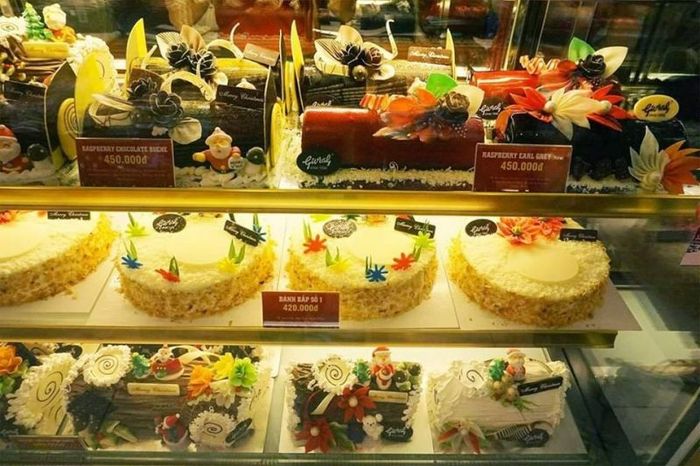 For those who love the taste of French pastries, adore the rich aroma of cheese, the bittersweet taste of chocolate, and the warm fragrance of a hint of rolled wine in the cake layers. Givral offers specialties like Tiramisu, Black Forest, Raspberry Chocolate Buche, or Corn Cake with soft sponge layers blending with fresh milk cream, milk chocolate, and almonds. If you haven't tried them before, buy them now to savor.