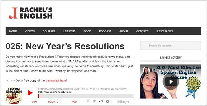 Her website offers prominent sections like videos, podcasts, books, lessons, and English courses. The videos section is always the highlight, helping you refine your pronunciation. Regarding books, you can practice reading comprehension. The podcasts are also quite interesting. Each podcast is around 1-2 minutes. Especially, the ''show notes'' section below helps you understand the main points in the episode. You can practice your listening skills through this section!