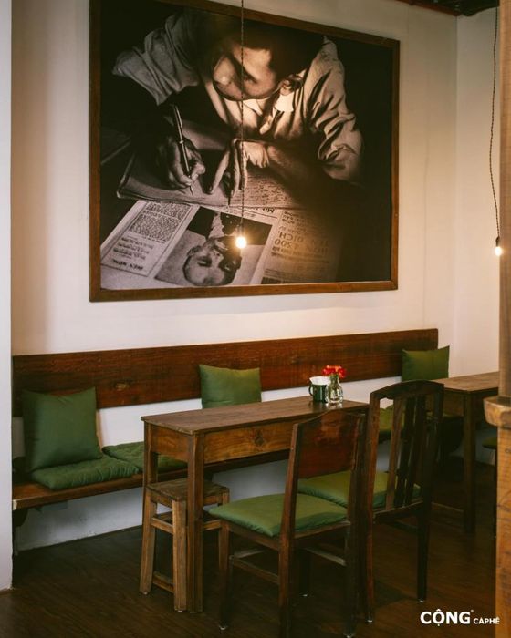 Cộng Cà Phê stands as a charming coffee shop amidst the hustle and bustle of Da Nang city, offering a blend of vintage and modern design elements. The café's unique appeal lies in its harmonious fusion of old-world charm and contemporary touches. The interior is thoughtfully decorated with books and antique items, all imbued with a sense of nostalgia, making it a perfect spot for those seeking a calm, reflective space. The overall atmosphere feels like a cozy retreat, framed by the nostalgic greens of military-style decor.