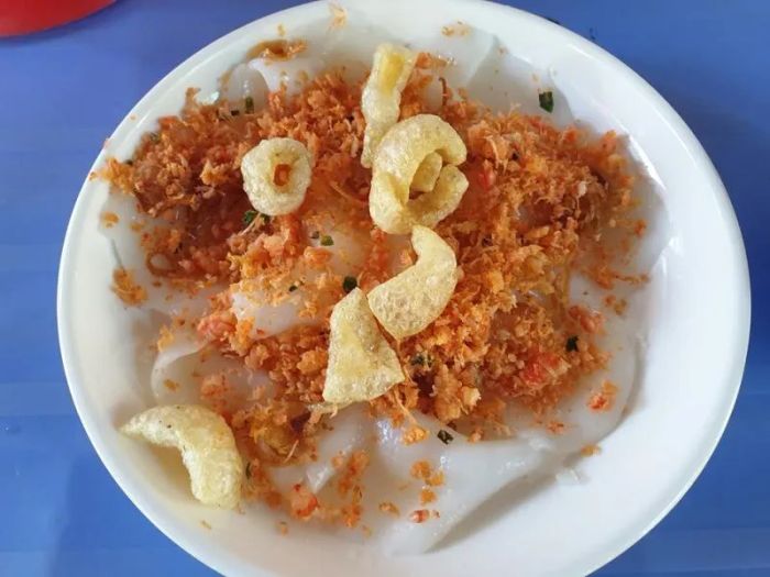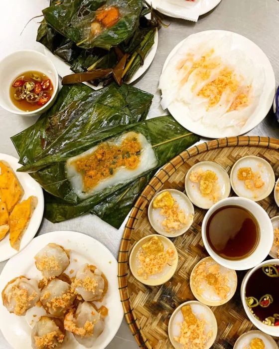 The simple ingredients come together beautifully in this dish, offering a visually appealing and aromatic experience. The transparent dough, vibrant yellow of shrimp, green of spring onions, and brown of pork create a colorful and delicious contrast when paired with a tangy dipping sauce. This snack has long been a nostalgic treat for those from Hue who are far from home.