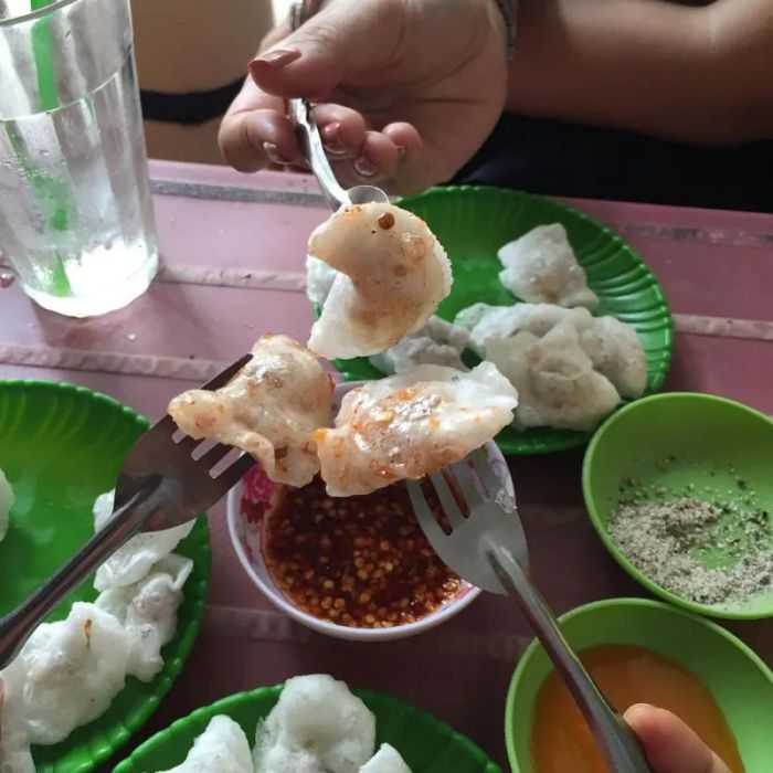 Bánh Ép is a unique and flavorful snack that will stay with you once you try it. Made from a thin, diluted tapioca flour batter, it's cooked on a hot cast-iron mold, with fillings like pate, meat, or eggs, depending on your preference. The dough is pressed to perfection, and it's served hot with a side of pickled vegetables like salted papaya or cucumber. The dipping sauce is a spicy mix of fish sauce, satay, and chili, which gives this dish an irresistible aroma and taste. The warm, savory flavor makes it a local favorite.