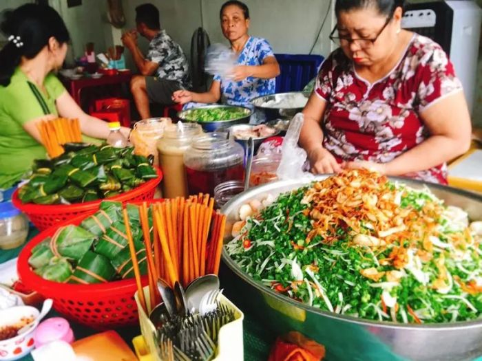 The soup is packed with ingredients like water spinach, herbs, banana blossom, bean sprouts, roasted peanuts, crispy pork skin, and a mix of sweet and sour fish sauce. The key to its authentic flavor is the herbs and shrimp paste, which must come from Hue to bring out the dish's distinctive aroma. To enjoy it the right way, add chili, mix well, and pour the clam broth over the noodles.