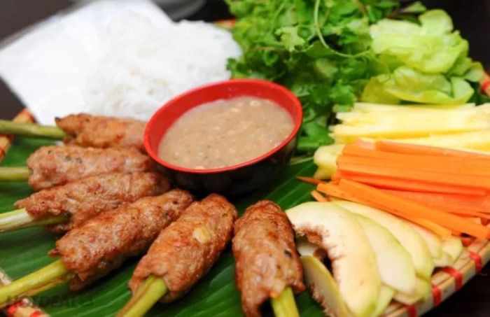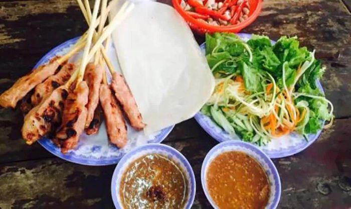 For street food lovers, Nem Lụi is a must-try dish, renowned for its rich, mouthwatering flavor. Made from minced pork mixed with pigskin, fat, and a blend of spices, it’s skewered on sugarcane or lemongrass sticks and grilled over hot coals. The best way to enjoy Nem Lụi is when it’s freshly grilled and served hot, paired with fresh herbs and a savory dipping sauce.