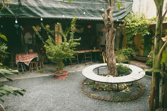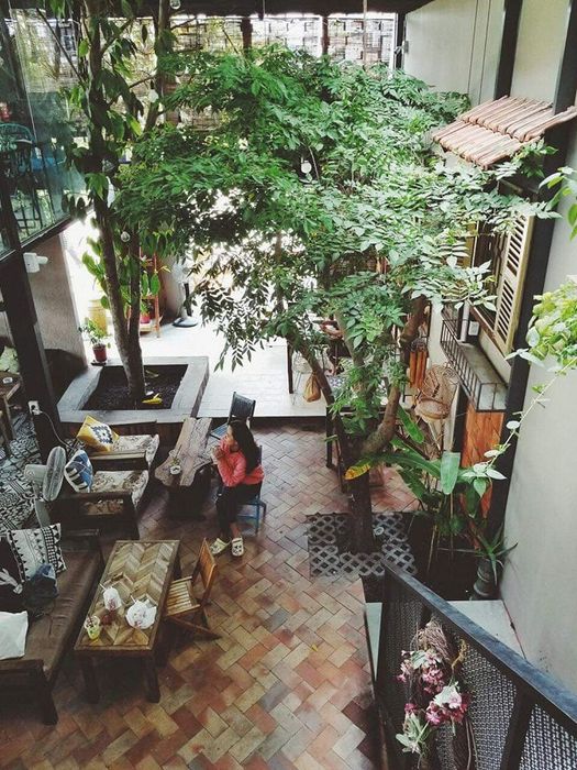 Blending nature’s serenity with the existing structure of the building, the interior was creatively renovated, combining old and new furniture to create a surprising harmony. The large windows allow sunlight to flood the space all day, while the high ceiling with bamboo lanterns adds warmth and openness to the cozy space, complemented by red brick walls and wooden decor.