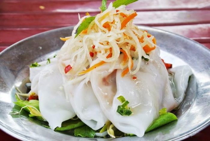 When you arrive in Bac Lieu, you'll spot vendors carrying trays of turnip cakes along the streets. These cakes resemble Chinese dumplings but are larger in size, with a milky white color revealing a pink filling, which is quite appealing to the eye. To make the outer layer, chefs soak the flour overnight. The process of mixing the flour is crucial as it requires just the right amount of water so that when the cake cools, the outer layer isn't too hard or too soft. Typically, the cake's outer layer is made from a mixture of wheat flour and finely ground turnip flour, rolled out into thin sheets.