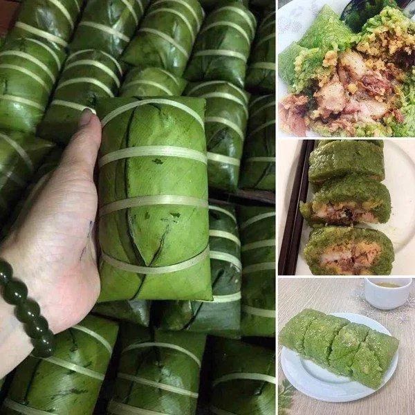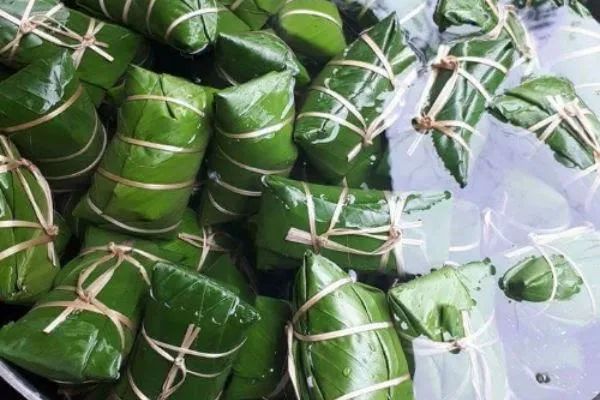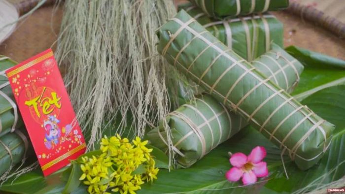 The offerings, placed on banana leaves, include alcohol, white sticky rice wrapped in dong leaves with egg, pork, chicken, and fish from the river cooked with banana stalks; additionally, the essential bánh chưng (square sticky rice cake) and bánh gio (also called bánh chì) are included.