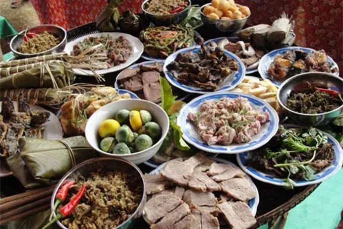 The Muong people believe that meat dishes should be served on banana leaves to preserve the unique aroma of the meat. The Tet feast must be nutritionally balanced with foods that are beneficial for health, and it should include a variety of tastes: sour, spicy, sweet, salty, and bitter. For the meal to be truly delightful and meaningful, it must be enjoyed in an open, cool space with friends and honored guests. Signature Tet dishes include Pẻng năng (nàng cake), fermented fish, and chả rau đáu...