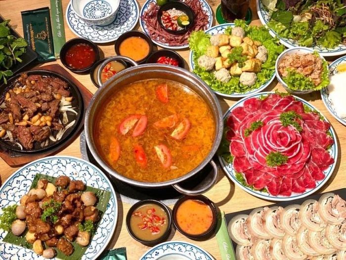 The beef hot pot at Thuy Restaurant – Beef Tơ Cu Chi comes with various side dishes, fresh meat, and premium vegetables. Each clay pot contains a large amount of meat, fragrant broth, and a selection of beer, wine, or carbonated drinks. The atmosphere is charming, bright, and spacious, with a friendly staff. When you visit this Tan Phu District beef hot pot restaurant, you can enjoy delicious dishes such as mixed beef hot pot, beef tail hot pot, spicy salt-grilled ribs, crispy fried frogs, shaking beef, stir-fried beef intestines with cabbage, and more. This beef hot pot restaurant is highly praised for its elegant, airy space, ideal for family gatherings and social events.