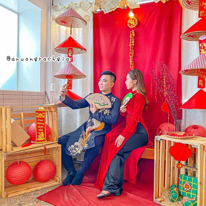 The space at Dear May is not overly spacious, but the tables and chairs are thoughtfully arranged, including single tables, double tables, and long tables for large groups. The comfortable and private setting makes customers feel at ease. In addition to a variety of aromatic drinks, from coffee, tea, and fruit tea to shaved ice, Dear May also offers a selection of light snacks like kimbap, tokbokki, and stir-fried noodles, providing a decent choice for customers to enjoy. The cafe has invested in a consistent overall aesthetic for its space. Despite the minimalist style, there is still a unique touch, especially with the addition of some red decorations for the Tet holiday, making it incredibly charming. I've got a whole album of Tet ao dai photos here, so everyone should make a visit.