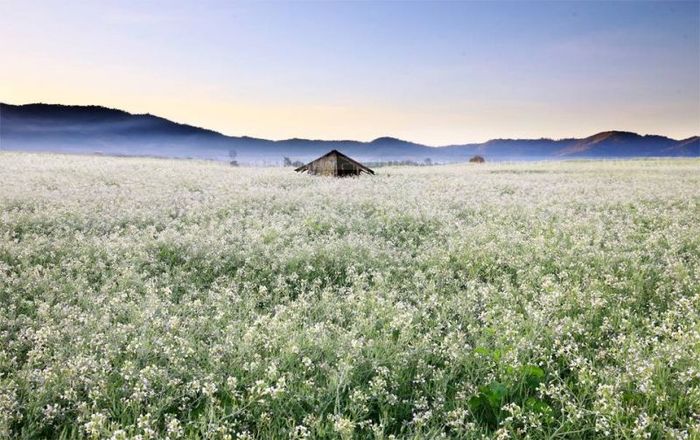 White Mustard Flower Field in Moc Chau, Son La is one of the famous tourist destinations attracting thousands of visitors each year in Vietnam. Located about 200 km northwest of Hanoi, Moc Chau is a beautiful highland with cool and fresh climate throughout the year. The special feature of Moc Chau is the vast white mustard flower fields, creating a picturesque and romantic landscape.
