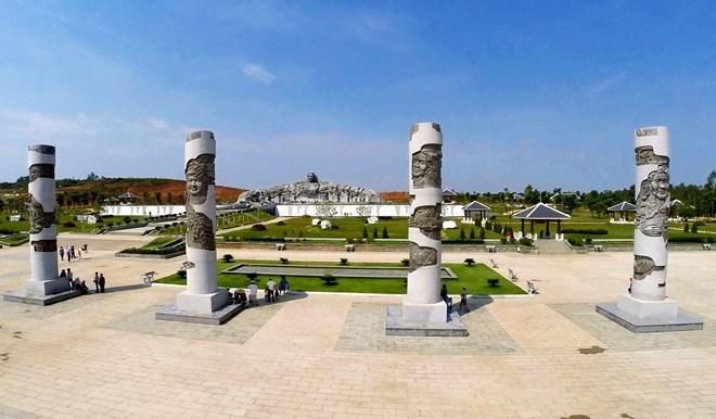 Mother Heroine Monument features a central portrait of Mother Nguyen Thi Thu, 18m high, with an arc resembling a mother embracing her children, 81m long (curved length is 101m), and the lowest part of the arc is 5.83m high. In front of the entrance gate are 8 legendary pillars, each 11.2m high, with a diameter of over 1.2m. In front of the statue is a forecourt with 30 grass squares symbolizing 30 years of resistance, made of basalt stone. Furthermore, the monument is hollow, and inside the monument block is the Memorial House of Vietnamese Heroic Mothers with an area of 400m², featuring plaques commemorating nearly 50,000 Heroic Vietnamese Mothers across the country. On both sides of the monument are two large floral carpets with an area of 600m² decorated with various motifs, representing the diversity of the 54 ethnic groups living in Vietnam. This is a monumental architectural work with immense historical significance.