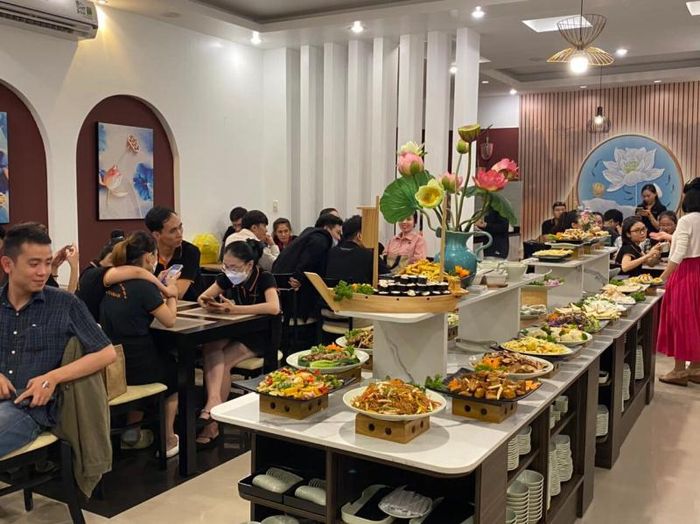 Nowadays, vegetarianism is a trend embraced by many people because it is beneficial for health and helps prevent the risk of diseases. However, a balanced vegetarian diet is needed to ensure adequate nutrient intake for the body. Vegetarian buffet restaurants are a reasonable choice for you to comfortably choose from a variety of dishes for your meal. Nang Sen Vegetarian Buffet Restaurant is an unmissable choice if you want to enjoy vegetarian food in Binh Thanh District. This restaurant has a fairly spacious and airy space. The interior mainly uses wooden materials with a subdued color tone. Additionally, the restaurant also emphasizes many paintings of lotus flowers to create a sense of elegance, tranquility, and closeness to nature.