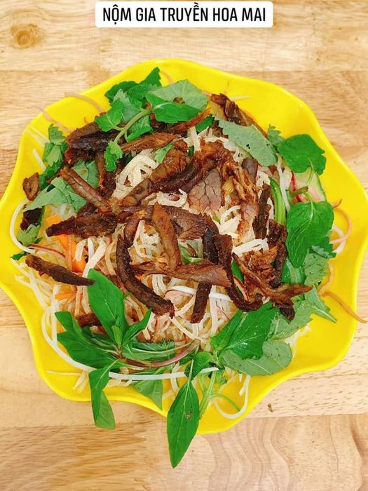 Another excellent spot for dried beef salad in Hanoi is Hanoi’s Traditional Dried Beef Salad - Hoa Mai, which offers a distinct twist with its unique preparation method. Known and beloved by locals, this place is a go-to for anyone who enjoys traditional Hanoi-style dried beef salad. The dried beef here is marinated with spices, sliced thin, and mixed with shredded papaya, fresh herbs, and a tangy-sweet fish sauce dressing, creating an authentic Hanoi flavor. It’s a favorite among snack lovers in the city.