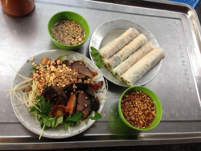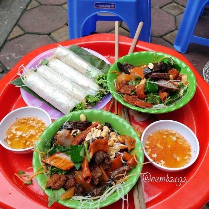 Cô Cúc's Dried Beef Salad is a small and humble eatery on Lò Đúc Street, embodying the simple charm of old Hanoi snack shops. This stall has been serving up delicious dried beef salad for the past 19 years, attracting many locals who crave a late-night bite. The salad includes shredded green papaya, fresh herbs, mint leaves, roasted peanuts, and a tangy-sweet sauce that is perfectly balanced with just the right amount of spice.
