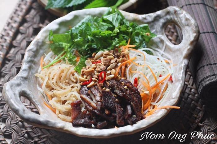 Another top spot for dried beef salad in Hanoi, Lim Salad on Hang Bun Street stands out with its unique preparation. The dried beef pieces resemble dark brown wooden logs, resembling the smoked buffalo meat from Vietnam's Northwest region.