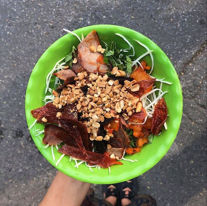 The dried beef salad here is adored for its unique and aromatic taste. The dish features crunchy shredded papaya, tender thin strips of dried beef, crispy roasted peanuts, and the fragrant aroma of Vietnamese mint leaves. The salad is even more distinct thanks to the addition of pig skin, which pairs perfectly with the papaya, roasted peanuts, dried beef, and herbs. It's a one-of-a-kind combination that makes this dried beef salad stand out from others.