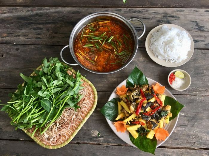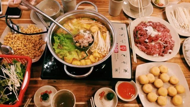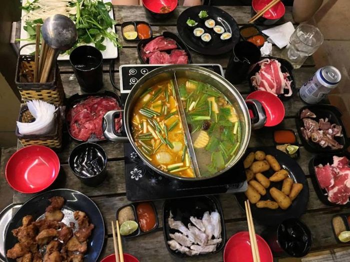 Let's enjoy! During Hanoi's transitional weather or cold winter evenings, sitting with friends around a pot of lightly sour and fragrant hotpot, bubbling with beef and various spices like lemongrass and pineapple, makes passersby want to step right in to savor the aroma and flavors.