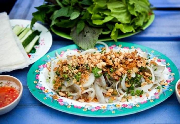 Enjoying snakehead fish salad is a must with aromatic herbs and various leaves such as water mimosa, centella, young mango leaves... along with green mango, sour star fruit, thinly sliced green bananas. When eating, roll the fish with rice cake, dip it in the broth, and you will experience the rich taste of the fish, the nutty flavor of coconut, the spiciness, the sourness, and the refreshing sweetness, making it truly special and unmatched anywhere else.