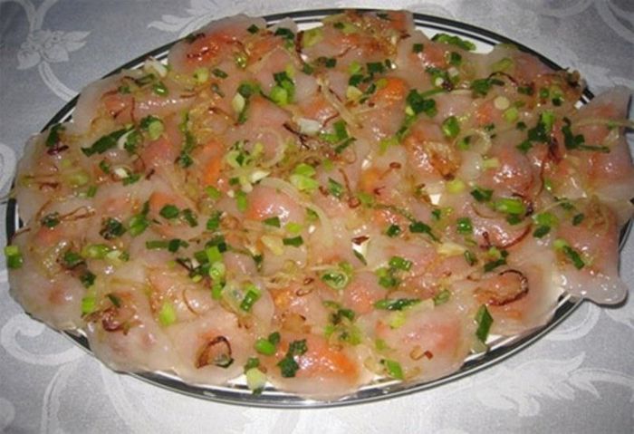 Bánh Bèo is a traditional cake found throughout the country, including regions like Huế, Nghệ An, Quảng Bình... However, Hà Tĩnh's version of Bánh Bèo brings its own culinary essence. Made from rice flour, the filling consists of peeled baby shrimp or minced lean meat sautéed with dried shallots. It is then served with fresh herbs.