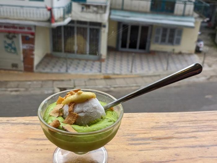 Thanh Thao Avocado Ice Cream has been around for years and is a popular spot not only for tourists but also for locals. The avocado ice cream here is rated the best in Da Lat, with a flavor that leaves a lasting impression and is easily addictive. The ice cream is made from freshly blended avocado mixed with milk, sugar, and especially thick, creamy durian chunks, all topped with a scoop of rich coconut ice cream. Most visitors end up ordering at least two servings to fully satisfy their cravings.