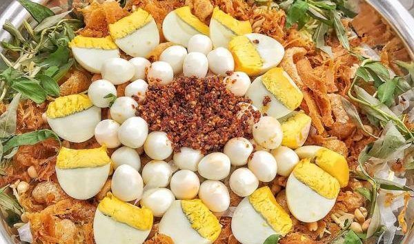 The preparation of the chicken organs and meat served with the bánh ướt is a meticulous process. The chicken innards are marinated with a blend of spices, garlic, and onions, ensuring they have a rich, savory flavor without any unpleasant odor. A bowl of bánh ướt lòng gà typically includes shredded chicken, chicken liver, heart, fresh egg yolks, peanuts, crispy fried onions, and aromatic Vietnamese coriander. A full serving costs around 35,000 VND, and it’s incredibly filling. In addition to the bánh ướt, the shop also offers crispy bánh chiên (fried cakes) and delicious chicken porridge, which are well worth trying. Finding bánh ướt lòng gà elsewhere can be quite difficult, so make sure to enjoy this specialty while you’re in Da Lat.