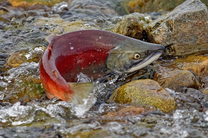 Characteristic of the species, salmon swim upstream to spawn: they are born in freshwater, migrate to the ocean, and return to freshwater to reproduce. However, some salmon species live their entire lives in freshwater. Popular folklore suggests that salmon return to the exact spot where they were born to lay their eggs, and research has confirmed this is true. This behavior is thought to be guided by their olfactory memory.