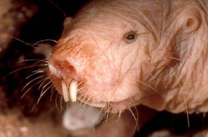 The naked mole rat, with its wrinkled pink skin, hairless body, and saber-like teeth, relies on its sensitive tactile hairs to navigate its near-blind world. It is one of the longest-living rodents, remaining healthy throughout its lifetime. Its skin is impervious to acid or chili, and it is the only known cold-blooded mammal on Earth.