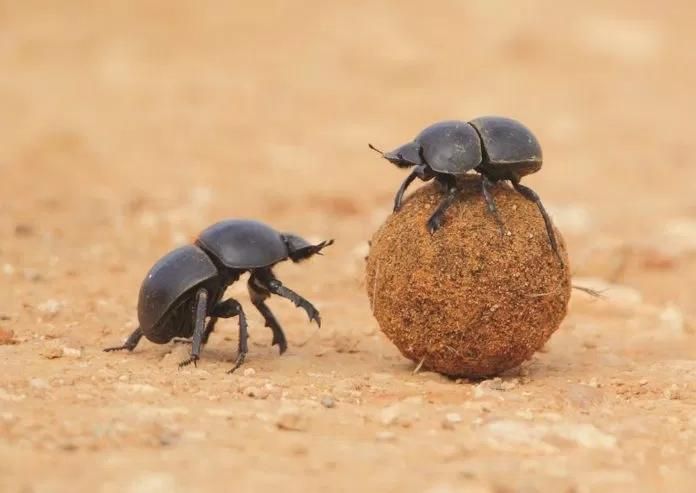 These beetles search the ground for fresh dung, landing near a pile, and using their shovel-like head and front legs to scoop up wet dung and earth. They roll the collected material into balls, pushing them forward, with the male typically leading the charge and using his back legs to push the ball. The female follows closely behind, pushing the ball from behind.