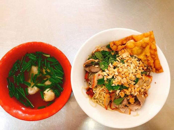 Each bowl of tossed wonton noodles comes with pork slices, liver, quail eggs, and shrimp wontons. In addition, Thành Vy Wonton Noodles offers a bowl of broth accompanied by vegetables and chives. The broth also contains liver, shrimp wontons, and quail eggs. Everything is rich and flavorful, with a slightly sweet taste, but reducing the seasoning a bit can make it more balanced. Alongside the tossed wonton noodles, there are also crispy fried dumplings, fragrant with the scent of pepper. The tender and aromatic barbecued pork, just a whiff of it makes your mouth water. The large shrimp, the generous-sized fried wonton, the chewy liver, the flavorful quail eggs—all contribute to making this noodle bowl worth the anticipation.