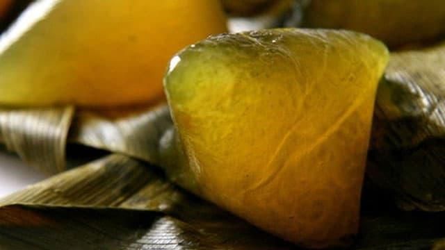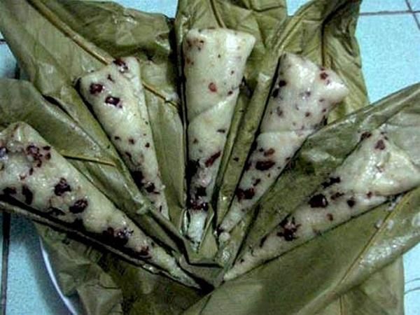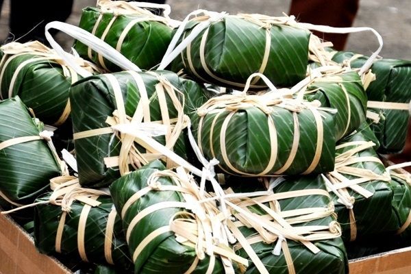 The cake is usually wrapped in leaves taken from the forest, either long leaves or mai leaves. After bringing the leaves home, cut the stems and ends, the leaves are about 30 - 35 cm long, clean them, then boil them to make them soft and easy to wrap. When wrapping, place two leaves on top of each other, hold both ends of the leaves and squeeze them crosswise to form a funnel shape, use a small cup to scoop rice and pour it in until the leaves are full to the mouth. When wrapping, each cake is about 1.5 cups of rice, like a water-drinking cup. Hold the lower part with one hand to prevent the rice from slipping, hold both ends of the leaves together, fold them down to seal the rice, and then bend the leaves to one side. After that, use rattan string or small twigs to tie it. The cake has 4 corners, three sharp corners and one obtuse corner. After wrapping, put the cake in a pot and steam it for about 4 hours, then take it out to cool.