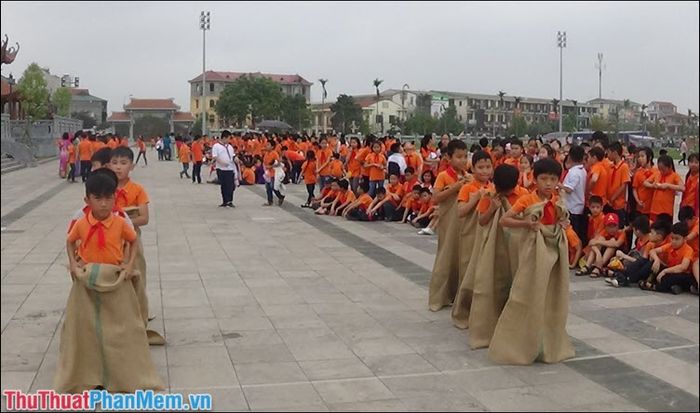 - The organizer will divide the group into teams with equal numbers, ensuring a mix of genders. Each pair will stand in a sack, arranged vertically behind the starting line, awaiting the command.