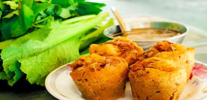 Thanks to the hard-working nature of the Khmer people, they've created a variety of distinctive pastries, passing down the traditional flavors from generation to generation. Bánh cống is made from rice flour and soybean flour for the crispy shell, filled with minced pork and shrimp. It's typically served with fresh herbs, and the combination of the rich pork fat, the sweetness of shrimp, the nuttiness of mung beans and soybeans, and the bold spices creates a dish that's both savory and subtly spicy. This dish is uniquely made in Đại Tâm Commune, Mỹ Xuyên District, Sóc Trăng.