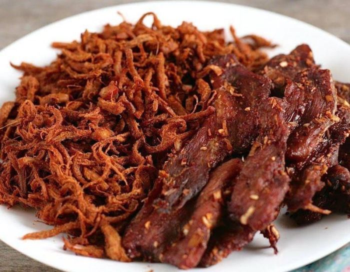 Thạnh Trị Dried Buffalo Meat is made in the traditional style. The buffalo meat is sliced into large, thin pieces, slightly larger than the size of a hand, and then marinated with garlic, salt, chili, and minced lemongrass. After marinating for about half a day to allow the flavors to soak in, the meat is dried in the sun or in an oven. The result is thin, fragrant pieces of dried buffalo meat with a distinctive scent of lemongrass and buffalo. It typically takes over 4kg of fresh meat to make 1kg of dried meat. Additionally, buffalo meat has a cooling effect, is rich in protein, and contains less cholesterol than beef, making it a healthier choice. In the Phú Lộc town of Thạnh Trị district (Sóc Trăng), there are two well-known places to buy this dried meat: Sáu Sành and bà Sùng's shops, while in Sóc Trăng city, you can also find it at Khánh Hưng Hotel's company.