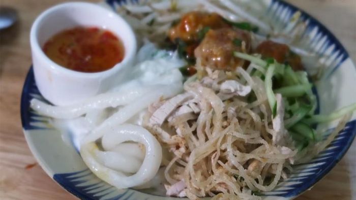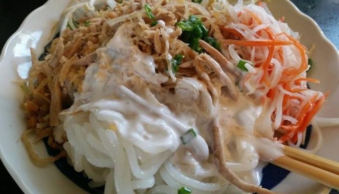 To serve, the rice noodles are placed on a plate, topped with pork, skin, and fresh vegetables, and then drizzled with hot coconut milk and dipping sauce. The result is a mouthwatering dish that offers a balance of flavors and textures, with a rich, creamy finish. The dish is popular in southern provinces like Trà Vinh, Bạc Liêu, and Cà Mau, where it is often enjoyed during special occasions.