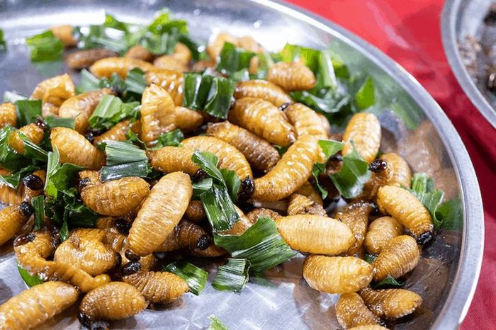 One of the most daring ways to enjoy coconut worms is raw, dipped in spicy fish sauce. The live worms squirm as they are dipped into the sauce, creating a thrilling culinary experience. Another popular way is grilled coconut worms. The fattest ones are skewered on sharp bamboo sticks and roasted over a small charcoal fire. Once golden and crispy, they are served with fresh herbs and sour tamarind dipping sauce, a combination that brings out the full richness of the worms and enhances their flavor with the tangy, salty, and sweet notes of the sauce and herbs.