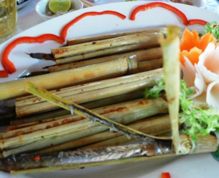 The fresh mudfish is cleaned and marinated with spices before being placed inside a reed tube to be grilled over glowing charcoal. As the reed tube heats up and shrinks, the heat from the tube cooks the fish, infusing it with the natural aroma of the reeds. This grilling method keeps the fish tender and juicy, with the flavors enhanced by the reed’s natural essence. The fish is typically served with a simple dip of salt, chili, and lime. Fresh herbs and sour banana slices are commonly served as accompaniments, adding a refreshing contrast to the rich flavor of the fish.
