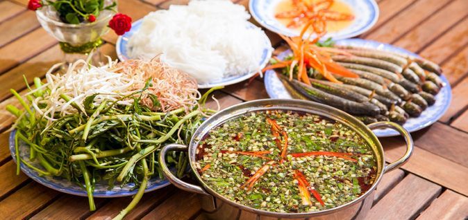 Once the broth is boiling, the live fish is added along with aromatic herbs and vegetables. As the fish cooks, the delicious aroma of the spices and fish fills the air. The fish meat remains tender and flavorful without falling apart, and the slightly bitter taste of the fish’s internal organs adds depth to the dish. It is also believed that the fish’s innards contain enzymes that aid digestion and relieve back pain. The Mekong Delta Fish Hotpot with sour morning glory leaves offers a truly unique experience, with the soft fish meat blending perfectly with the distinct tartness of the leaves, complemented by vegetables such as banana blossoms and water spinach. It’s a dish that will captivate any guest, even the pickiest eaters. If you ever find yourself in the Mekong Delta, don’t miss out on this incredible hotpot!