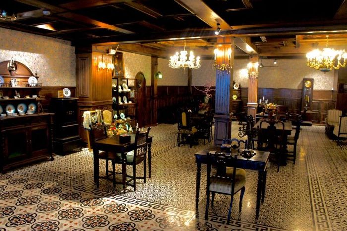 Café Paul 1932 offers a spacious, airy setting with a dark, classic color palette. Walking into Café Paul 1932 is like stepping into a grand gallery filled with art and antiques dating back centuries. Every corner is meticulously decorated with vintage treasures that showcase a refined aesthetic and a passion for collecting. The simple furniture creates a cozy and inviting atmosphere. The unique tile floor stands out, adding to the nostalgic charm of this historic space.