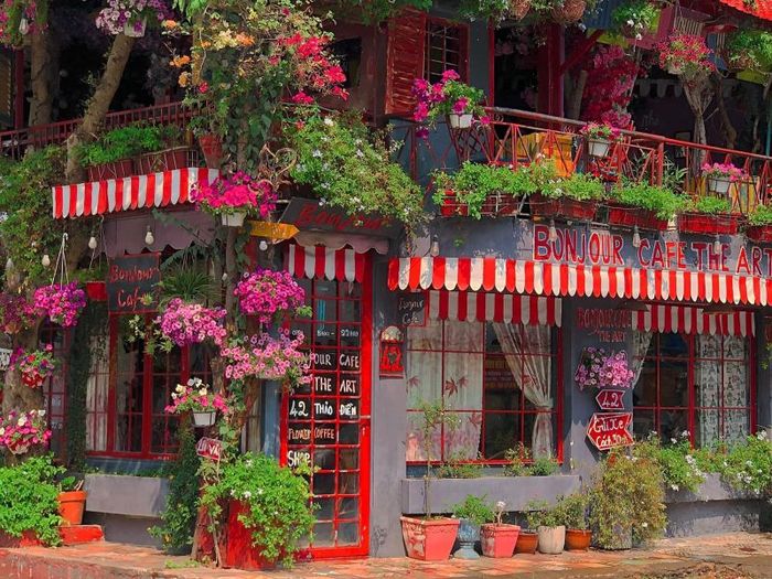 Bonjour Cafe The Art is a charming French-style cafe located in the heart of bustling Saigon. The cafe features a beautiful balcony adorned with hand-planted flowers by the owner, offering a heartfelt gesture of appreciation to customers. The cafe is full of cute details, such as swings, bicycles, vintage chairs, and window frames, making it the perfect spot for taking stunning photos against a vibrant red backdrop.